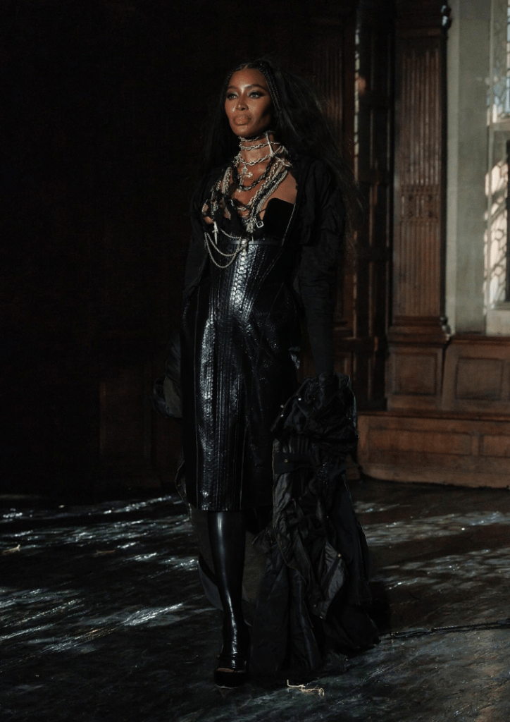 Unkemptness and disarray transition into something much more structured as the show progresses, with hair falling smooth and tightly braided, and flowy ripped fabrics transitioning into stiff boned leather. ‘Cages’ appear in metaphorical forms – chainmail ornaments are applied directly to the face as an armour shielding the eyes and cheeks. Necklines reach high to choke its models. Latex gloves and tubed silhouettes tighten and constrict the form.