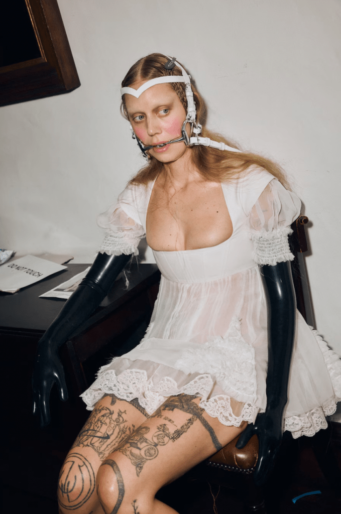Findikoglu’s collection explores the effect that the control of female innocence has on women’s relationships with themselves, and with each other. On the runway, she presents the idea of ‘innocence’ and the idea of the ‘cage’ within the same equal plane. The looks speak to each other – for example, the cherries used to stain a corseted ivory tube dress are echoed in another look where cherries and feathers spill out of a handbag. In the latter look, the model also wears a corseted dress, however this one appears tightly tied at her shoulders. Her hair is braided like a rope, her eyes are wide and mud is smeared across her forehead giving her a ‘hunted’ appearance. In a third monochromatic red look, the girl is ‘contained’- her extremities are bound in latex gloves and socks, her arms are cuffed to the elbows with metal bangles, and her dress conceals her body from her neck to her ankles, with metal stitching running down between the legs.