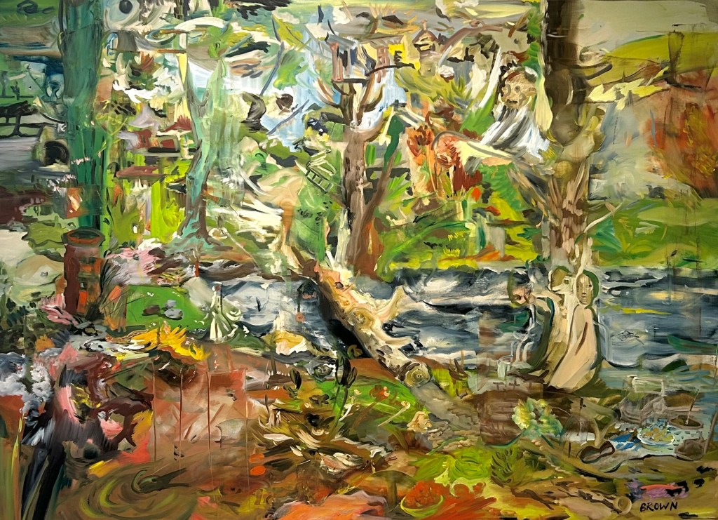 The show gathers works from 2001 to the present, forming a cohesive snapshot of Brown’s evolving practice. Across varyingly sized supports, familiar motifs recur: entwined couples, playful woodland scenes, and fragments of riverbeds dissolving into flurries of brushwork. These images oscillate between recognition and abstraction, never fully resolving, urging the viewer to study them closely, and then some.