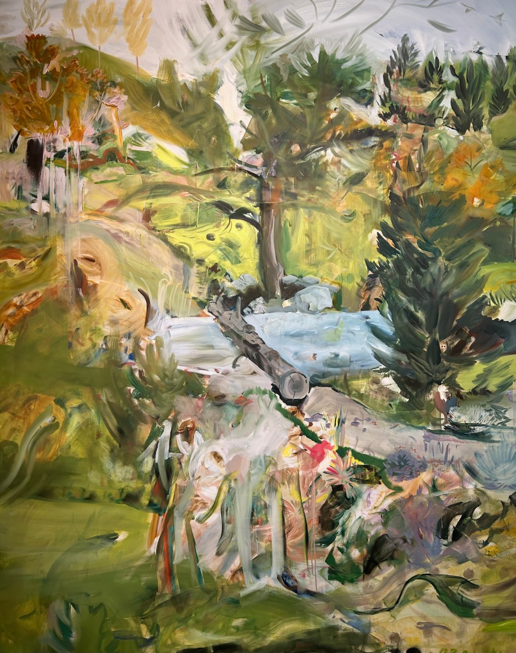 Trees, a lake, a log cabin, a waterfall, a deer and a sunset (2024)features a composition that stretches across the canvas so that the eye is forced into motion. It moves from corner to corner—registering the blue of the water, the log across the lake, the yellowing trees in the top left, the darker vertical of a tree at the middle-right. There is a flurry of figures and green; there is movement without hierarchy. You don’t quite know where to settle, but you carry the uncanny sense that you have seen this all before.