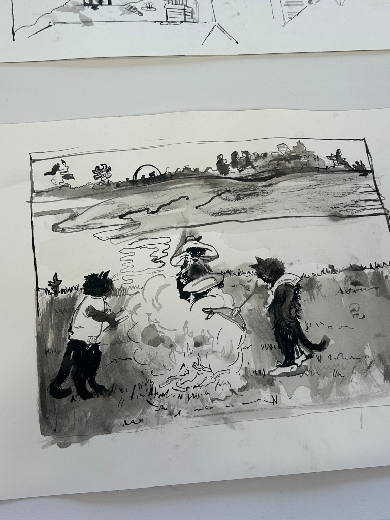 The exhibition is well-suited to its setting. Nestled within Kensington Gardens, the gallery situates Brown’s paintings within a landscape that feels both intimate and historically weighted. Her references—to canonical Western painting as well as the visual language of children’s book illustration—extend into her drawings, where anthropomorphic cats tinker away like blue-collar workers within calm, pastoral scenes. These moments introduce an underlying tension between innocence and unease. The decision to paint sections of the gallery walls a deep burgundy, rather than the expected white, intensifies this atmosphere, lending the works a darker, more enclosed resonance.